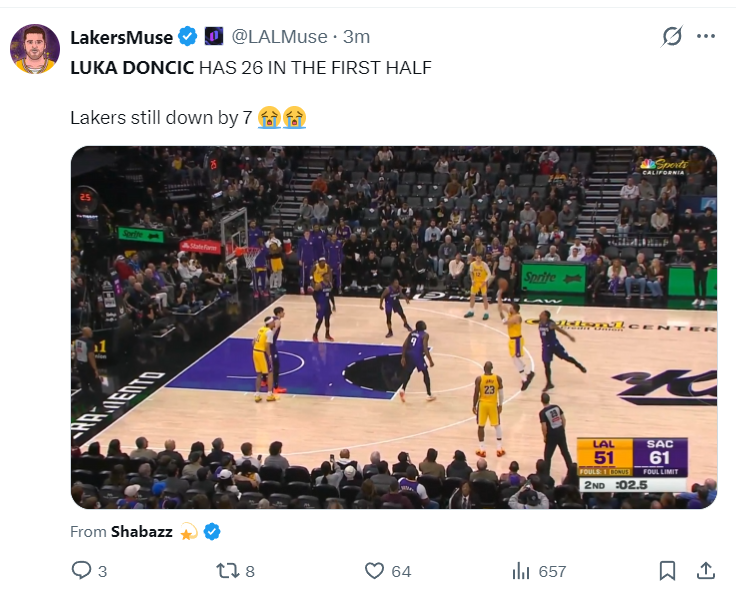 东契奇在上一场对阵雄鹿的比赛中表现极其糟糕,不仅送了致命的三分犯规,全场比赛25中8+6犯离场,防守端各种眼神防守遭湖人媒体口诛笔伐。东契奇跟施罗德的恩怨也在近期浮出水面,湖人媒体都觉得对阵国王这场是东契奇的苏醒之战,开场东契奇防守端还是眼神不错进攻手感好了不少,首节7中5拿到11分1篮板2助攻1抢断。